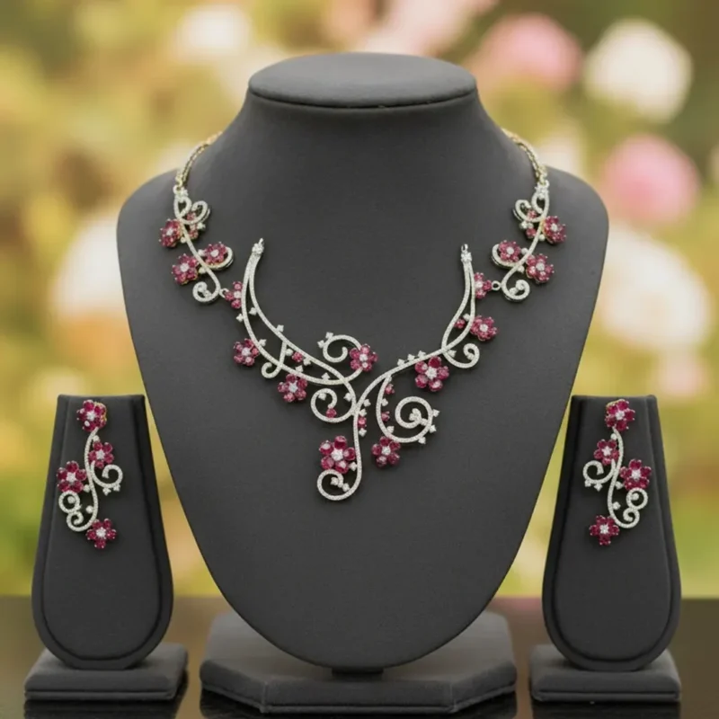 Elegant Gold-Plated Silver Floral Necklace Set with Ruby Red Stones